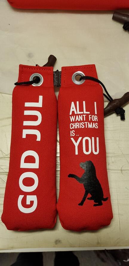 På den ene side står der God Jul, på den anden citat'et All I want for ..... og en silhuet af en hund.
