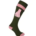 Super flotte jagtstrømper i mørk flaske grøn med pink detaljer på skaftt og tå og pink garters.