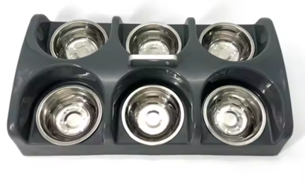 Hvalpebaren består af 6 foderskåle i rustfrit stål 350 ml.