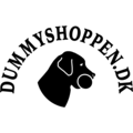 Paraplyen er grå og har Dummyshoppens logo printet på den ene side.
